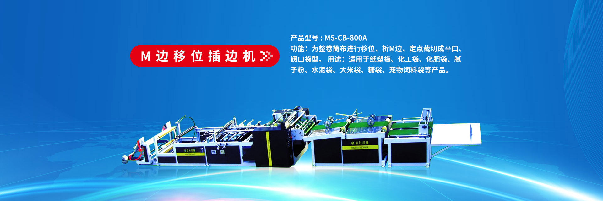 產(chǎn)品型號(hào) : MS-CB-800A 功能:為整卷筒布進(jìn)行移位、折M邊、定點(diǎn)裁切成平口、閥口袋型。 用途:適用于紙塑袋、化工袋、化肥袋、膩?zhàn)臃、水泥袋、大米袋、糖袋、寵物飼料袋等產(chǎn)品。