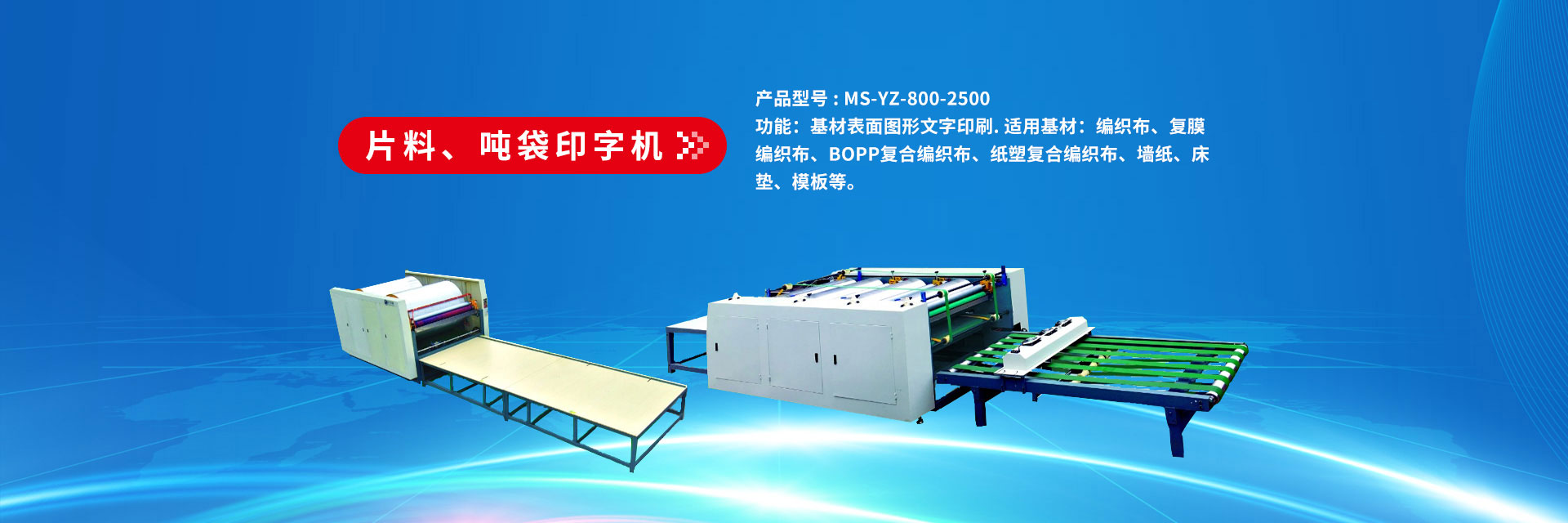 型號(hào):MS-YZ-800-2500 功能:基材表面圖形文字印刷. 適用基材:編織布、復(fù)膜編織布、BOPP復(fù)合編織布、紙塑復(fù)合編織布、墻紙、床墊、模板等。