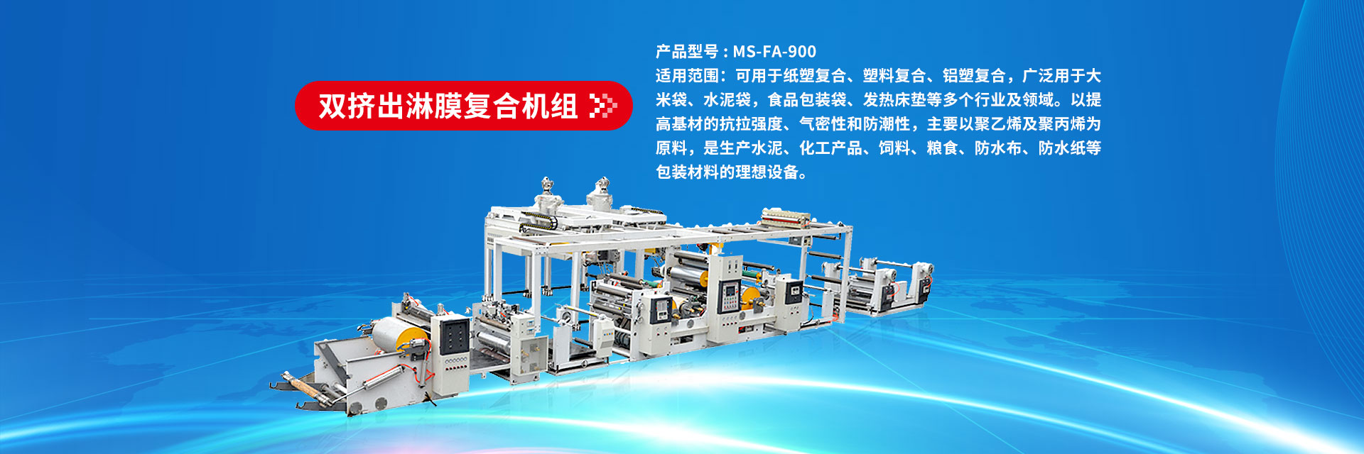 產(chǎn)品型號(hào) : MS-FA-900 適用范圍:可用于紙塑復(fù)合、塑料復(fù)合、鋁塑復(fù)合,廣泛用于大米袋、水泥袋,食品包裝袋、發(fā)熱床墊等多個(gè)行業(yè)及領(lǐng)域。