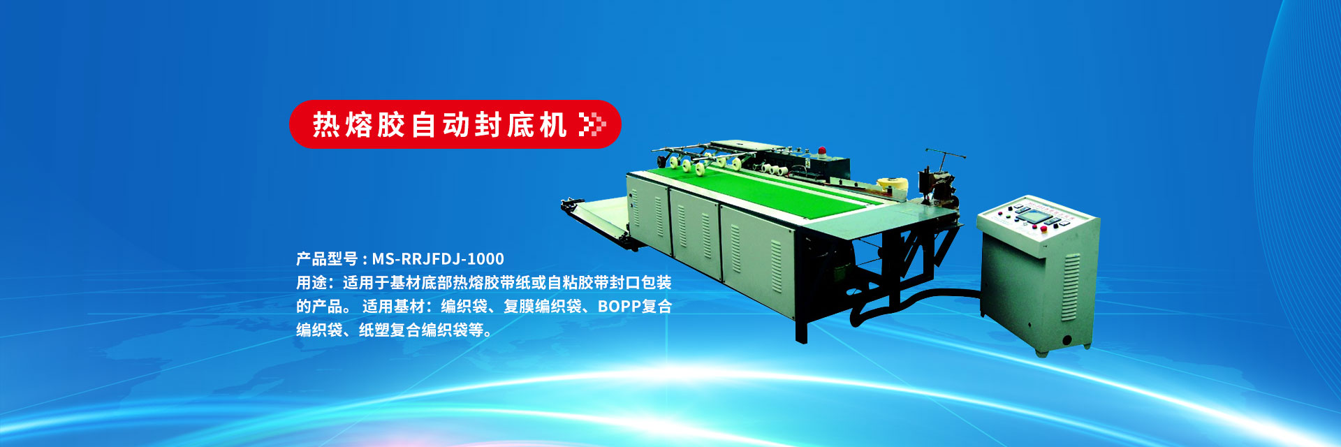 產(chǎn)品型號(hào) : MS-RRJFDJ-1000 用途:適用于基材底部熱熔膠帶紙或自粘膠帶封口包裝的產(chǎn)品。 適用基材:編織袋、復(fù)膜編織袋、BOPP復(fù)合編織袋、紙塑復(fù)合編織袋等。