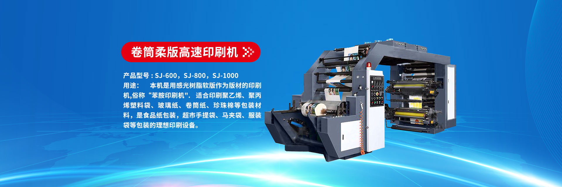 產(chǎn)品型號(hào) : SJ-600,SJ-800,SJ-1000 名稱:卷筒柔版高速印刷機(jī) 用途: 本機(jī)是用感光樹脂軟版作為版材的印刷機(jī),俗稱“苯胺印刷機(jī)". 適合印刷聚乙烯、聚丙烯塑料袋、玻璃紙、卷筒紙、珍珠棉等包裝材 料,是食品紙包裝,超市手提袋、馬夾袋、服裝...